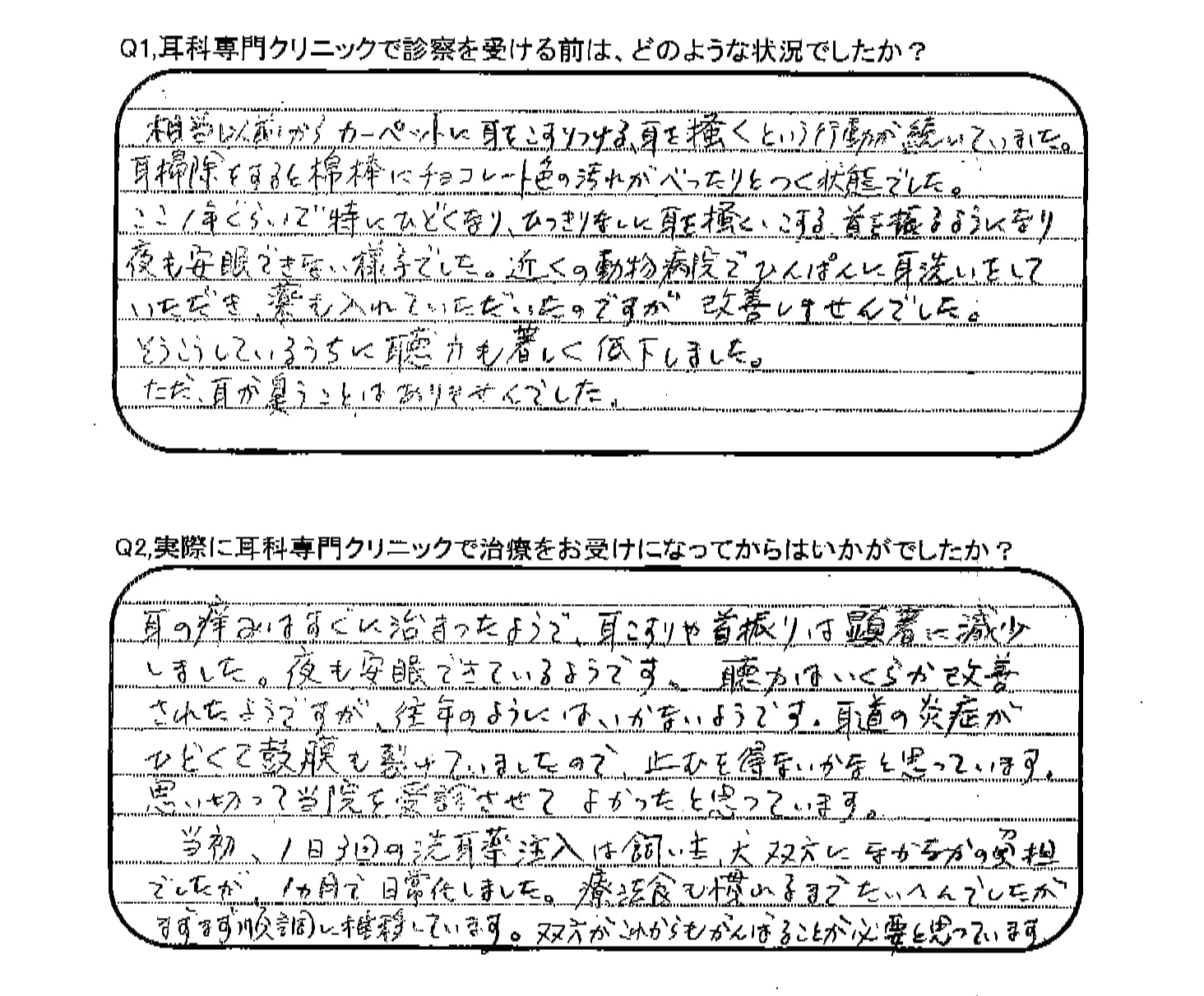 耳の痒みはすぐに治まったようで、耳こすりや首振りは顕著に減少しました。夜も安眠できているようです。聴力はいくらか改善されたようですが、往年のようにはいかないようです。耳道の炎症がひどくて鼓膜も裂けていましたので、止むを得ないかなと思っています。思い切って当院を受診させてよかったと思っています。